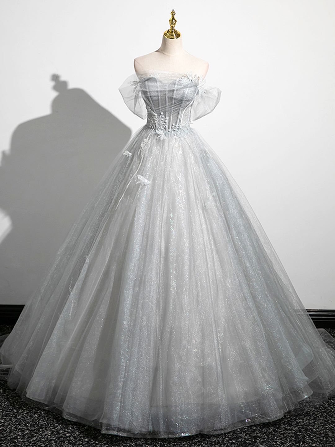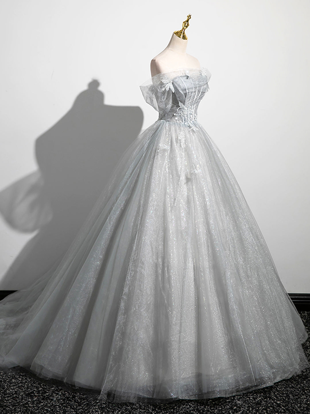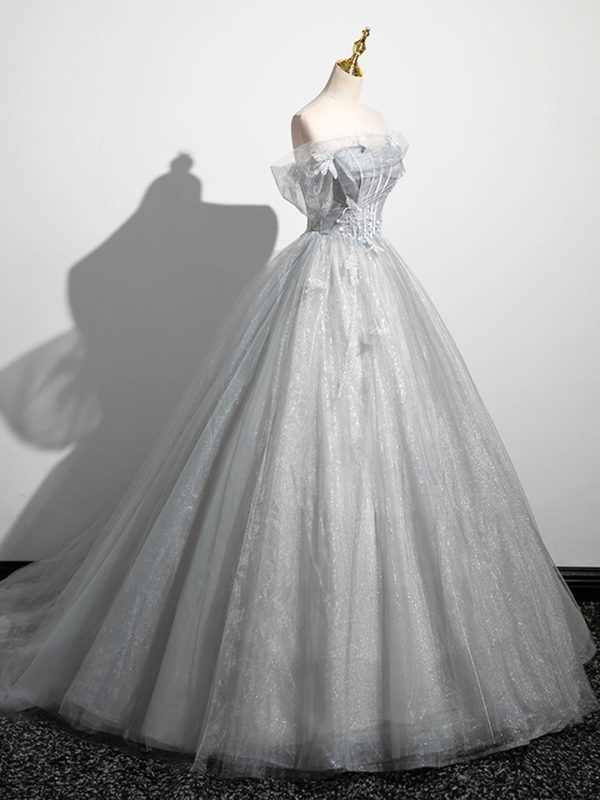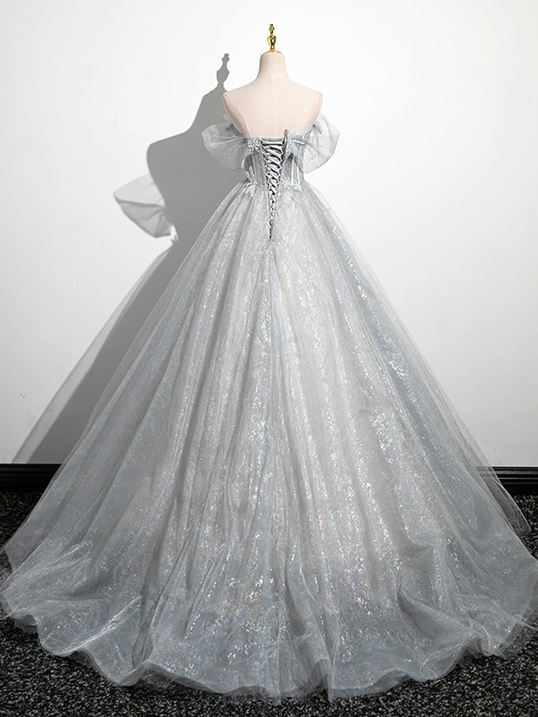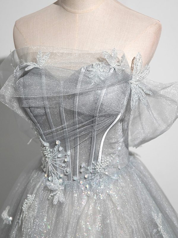 A-Line Off the Shoulder Sparkly Prom Dress, Gray Tulle Corset Floor Length Evening Dress